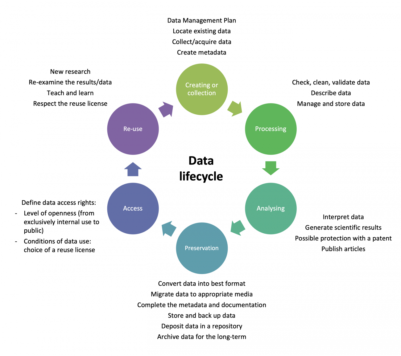 The data lifecycle has six broad stages: creation or collection, processing, analysis, preservation, access and reuse. Each stage of the cycle involves data management measures. These measures are represented on the data lifecycle diagram opposite (click on the image to enlarge it).