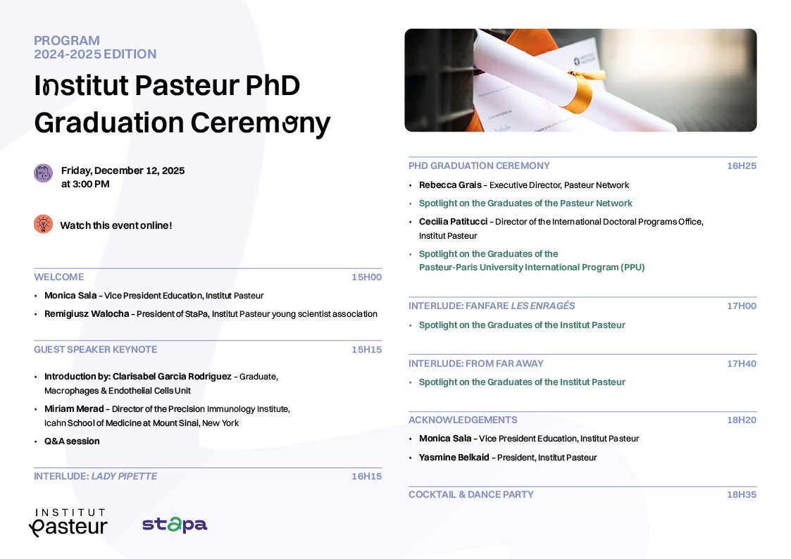 Since 2013, the Institut Pasteur organizes each year a ceremony for the students who have graduated during the year. This both solemn and festive event is open to all people working on campus and to family and friends of the newly graduated students, as well as representatives of partner organizations.