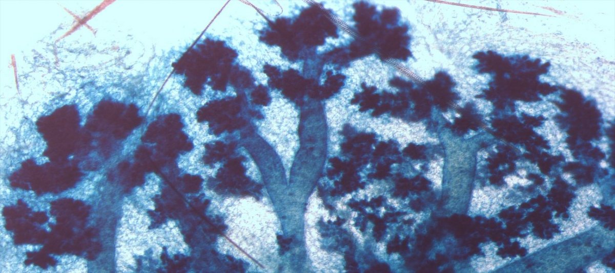 Left: Morphology of a mouse mammary gland after labeling to detect senescent cells (in blue).