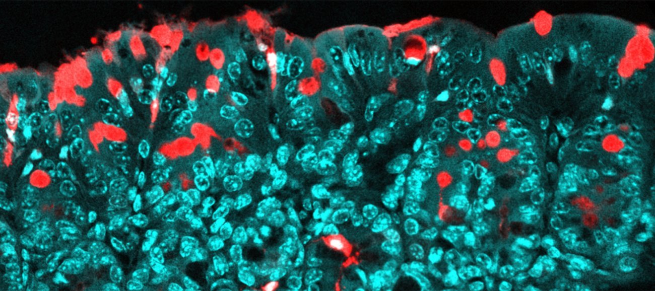 Passage of molecules through the colon epithelium via specialized pathways (goblet cells). In red: transported molecules (antigens); in blue: the epithelium. - Copyright: Institut Pasteur/Microbiota-Host Interactions/Clara Delaroque and Benoit Chassaing