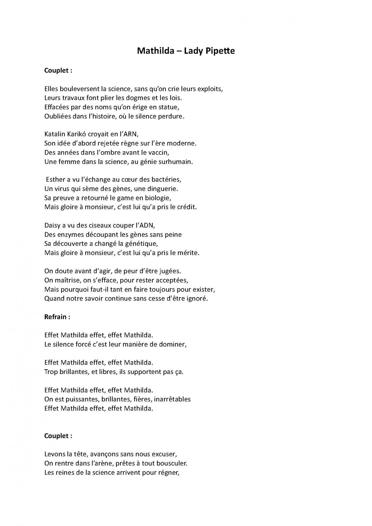 « J’aurais aimé pouvoir évoquer davantage de femmes scientifiques invisibilisées ou oubliées telles que Agnes Ullmann, Marie Pasteur, Lise Meitner, Élie Metchnikoff et tant d’autres, dont le parcours illustre aussi les conséquences de l’effet Matilda. Mais elles sont si nombreuses que le choix a été difficile ! Cette chanson est une invitation à découvrir toutes les femmes qui ont contribué à notre histoire et aux avancées majeures en science. »