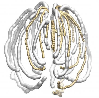 Iconographie : organisation 3D moyenne des 16 chromosomes de la levure de boulangerie. Les centromères des chromosomes sont co-localisés dans l'espace nucléaire (en haut). En doré : les cinq nouveaux chromosomes synthétiques. © Institut Pasteur