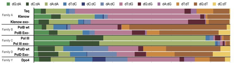 DNA polymerase error rates and profiles. (A) Fidelity measurements in substitutions in a million bases for the different families of DNA polymerases and their respective exo- mutant. (B) Substitution spectra for each DNA polymerase, with dA misincorporations in green, dC misincorporations in blue, dG misincorporations in pink, and dT misincorporations in orange. Legend corresponds to template strand:nascent strand mispair (i.e. dG:dA = template strand dG, nascent strand dA).